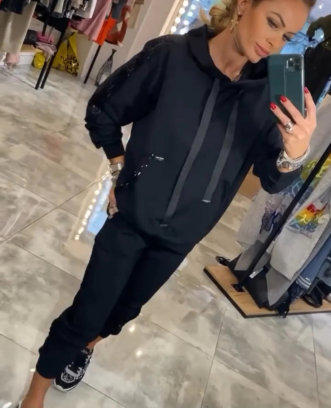 Applicazioni in paillettes sulle maniche e sui pantaloni per un effetto luminoso e glamour.